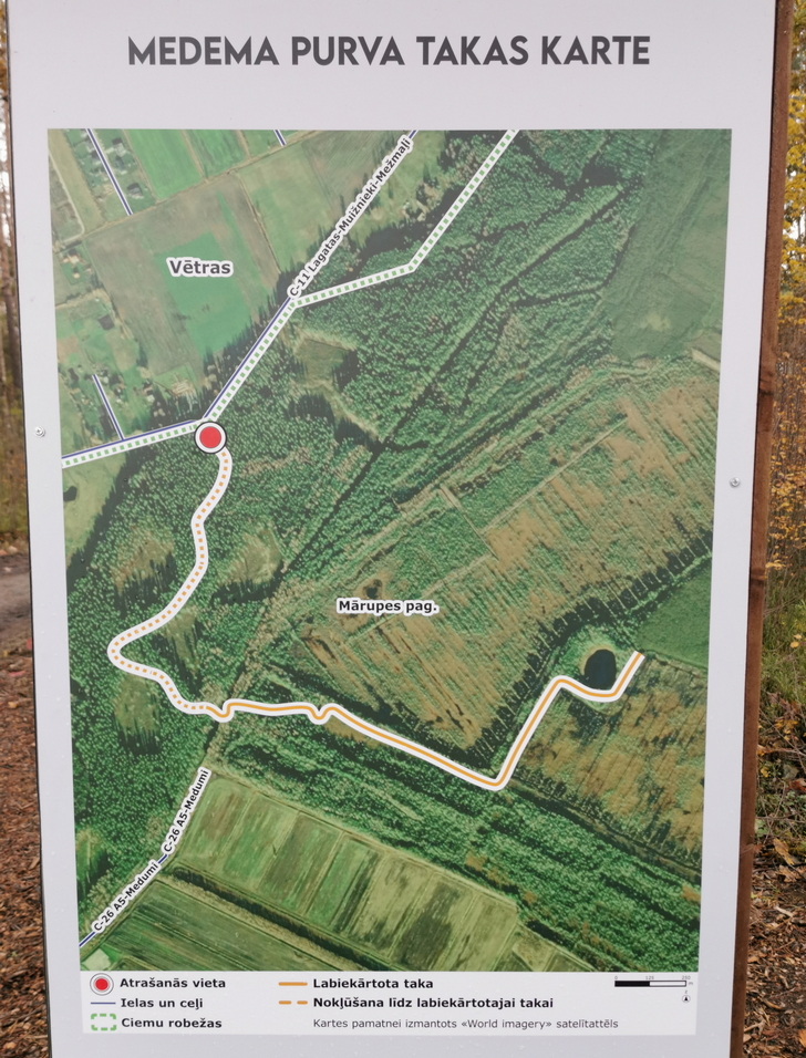 Aiz zirgu aplokiem ceļa labajā pusē meža malā ir novietots liels stends ar Medema purva takas shēmu. Blakus stendam mežā iegriežas divi nelieli ceļi. Pēc lietus tie bija dubļaini (bet ne neizbraucami) un es auto atstāju ceļa malā. Kā pēc brīža konstatēju, aiz pirmajiem dubļiem tālāk labs, stingrs un smilšains meža ceļš. Tā kā biju jau noskaņojies doties uz purvu (kājās īsi gumijas zābaki), tad atpakaļ negāju. Tikai uz priekšu! Ātrā solī paeju garām kādam jaunu cilvēku pārim, kuri piestāj pie katra krāsaina lapu koka, lai to nofotografētu. Uzmetu skatu viņu apaviem – zemas čībiņas ar baltu zolīti. Interesanti, cik tālu viņi ies?
