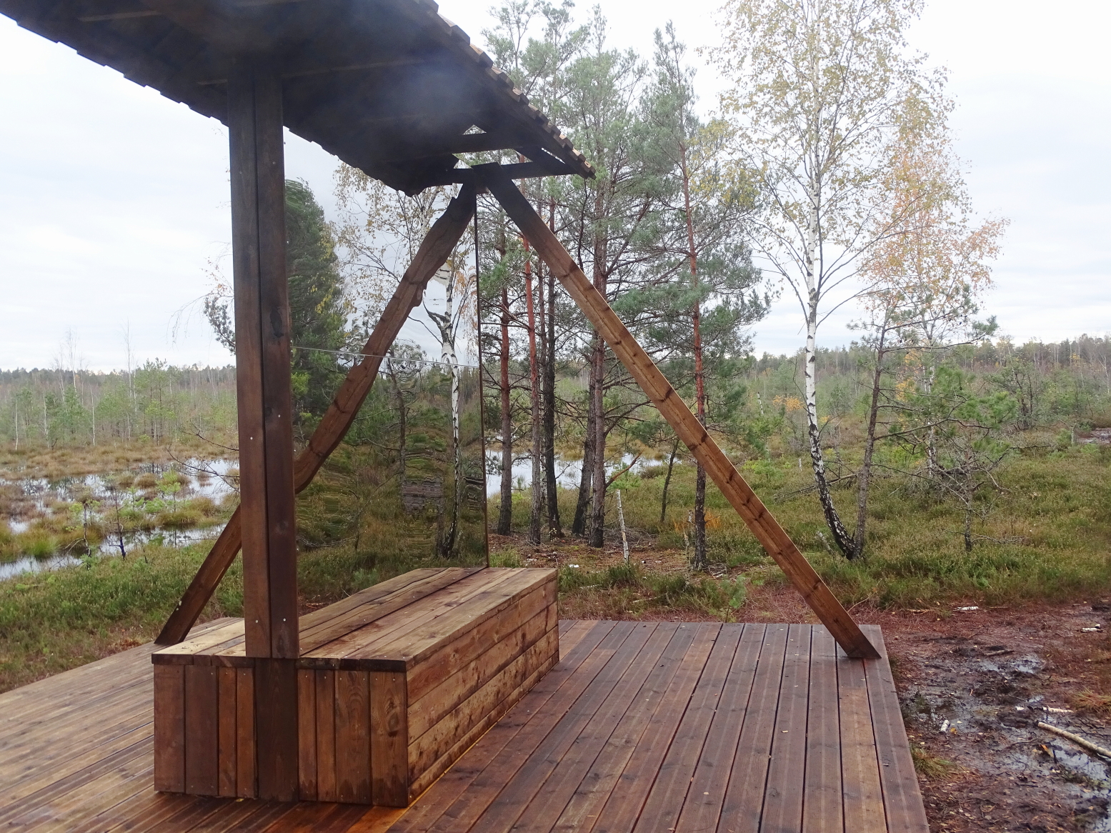 Ar koka dēļiem izliktās takas posms nav garš. Tālāk atkal “zemes” taka, kas izved meža klajumiņā pie maza, skaista purva ezeriņa. Tā krastā norādes par to, ka doties tālāk ezera krasta virzienā ir bīstami. Lai varētu netraucēti baudīt šo skaistumu. izvietoti ērti soliņi ar atzveltnēm. Ezera pretējā krastā lielāki soliņi, nojumes un lieli pulēto metāla plākšņu “spoguļi”. No nojumes uz vienu pusi var baudīt skatu uz pieminēto ezeru, pretējā pusē – uz purva ainavu.