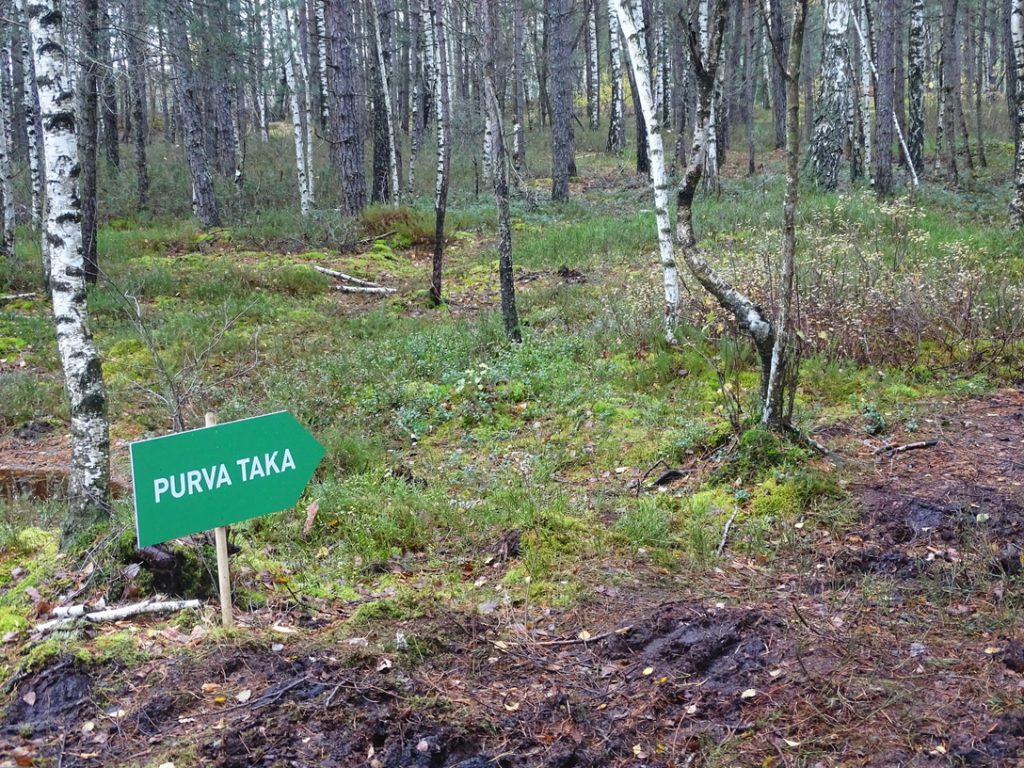 Aiz grāvja jānogriežas pa kreisi un klāt tā takas daļa, kas nosaukta par “labiekārtotu”. Zemes augstumā zaļas norādes “Purva taka”, krāsu marķējumi uz kokiem un … iemīta taka starp kokiem, ap un pāri ciņiem, nelielām ieplaciņām. Taka vietām mitra, bet palīkumojot pa mežu uz vienu vai otru pusi, var atrast arī sausākas vietas, ko var šķērsot pat bez zābakiem kājās.