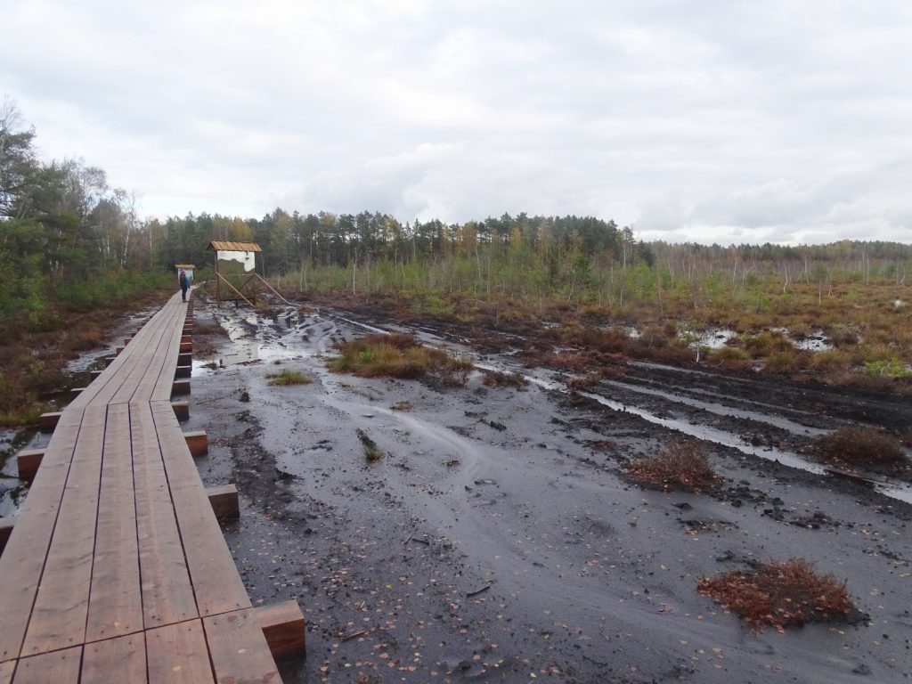 Vislielākais pārsteigums mani sagaidīja tad, kad nonācu atklātāka, acīmredzot izstrādātā purva malā, nelielā paaugstinājumā. Man priekšā plata, skaista, jauna koka dēļu taka, bet pirms tās – dažu desmitus metru gara (plata) melnu dubļu josla. Ievēroju, ka malās, starp mazajiem kociņiem, šo dubļu šķērsli var apiet. Kaut gan taisnā virzienā dubļos varēja redzēt arī kādu velosipēda riteņu atstātu sliedi. Droši vien iespiesta kādā sausākā periodā.