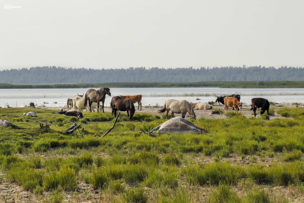 Vēl nedaudz uz priekšu pa ceļu un … negaidīts šķērslis. Pāri ceļam dzeloņstieples un aiz tām savvaļas zirgu bariņš. Tie izrādās nedaudz kustīgāki par govīm. Pavisam nedaudz. Arī zirgi ātri konstatē, ka nekādu kārumu viņiem man nav. Daži pat pagriež muguru. Pareizāk gan būtu teikt, laikam, parāda dibenus.