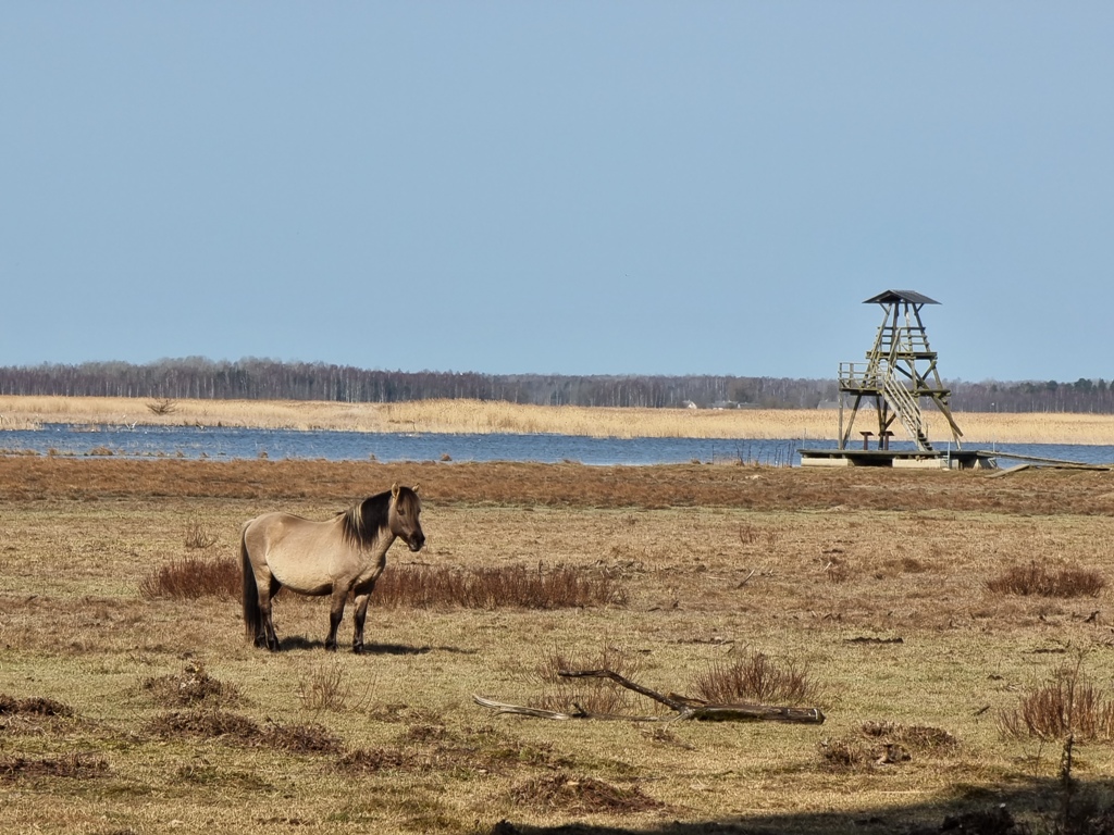 Tālāk soļoju jau raitā solī. Spirgta (vēsa) saulaina diena. Ezera krastu govis apstrādājušas vēl rūpīgāk par zāles pļāvējiem. Nav zāles, nav niedru. Arī no krūmājiem palikuši 20 – 30 cm gari kāti pie pašas zemes. Nonāku pie koka vārtiņiem, kurus aizvērtā stāvoklī notur gara spirālatspere (lai govis nenonāk mežā). Aiz vārtiņiem pa zemes uzbērumiem un zig-zag veida koka dēļu taku nonāku līdz putnu vērošanas tornim. Tornis vienkāršs, nav īpaši augsts (kā priekš manis). Apkārt klaigā putni. Netālu peld vairāki gulbju pāri. Palaikam var dzirdēt kā dumpis “iepūš tukšā stikla pudelē”.