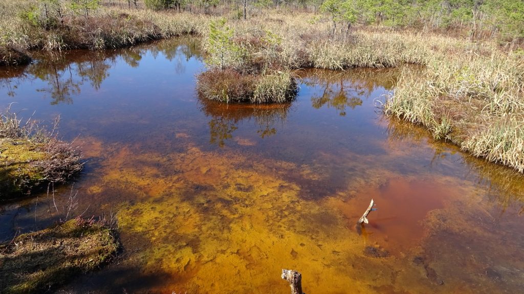 Dīķu ūdenī pavasarī savairojas mikroorganismi, kas dīķu ūdeni iekrāso dzeltenā krāsā. Tagad, maijā ejot, izņēmums bija pats pirmais dīķis takas kreisajā pusē. Ūdens tajā bija dzidrs, vien dīķa dibenu klāja dzeltenīgas nogulsnes.