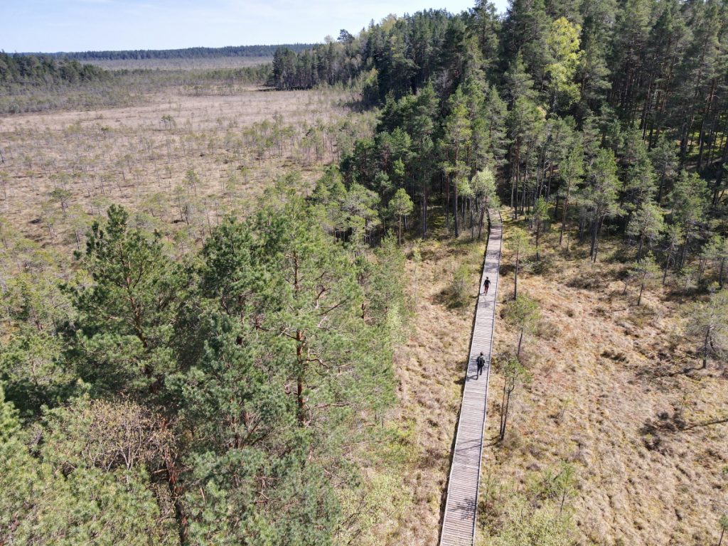 Pēc apmēram kopā noietiem 3 kilometriem īpaši slapjai vietai pārbūvēta gājēju koka laipa. Otra tāda pati laipa ir apmēram puskilometru tālāk, kur ir arī Zaļās kāpas smilšu pauguru (rindas) šaurākā vieta. Tas arī bija, iepriekš kartē noskatītais, mana tās dienas gājiena gala mērķis. Atgriezos Ķemeros. Pa ceļam papildināju savu fotogrāfiju un videomateriālu krājumus.